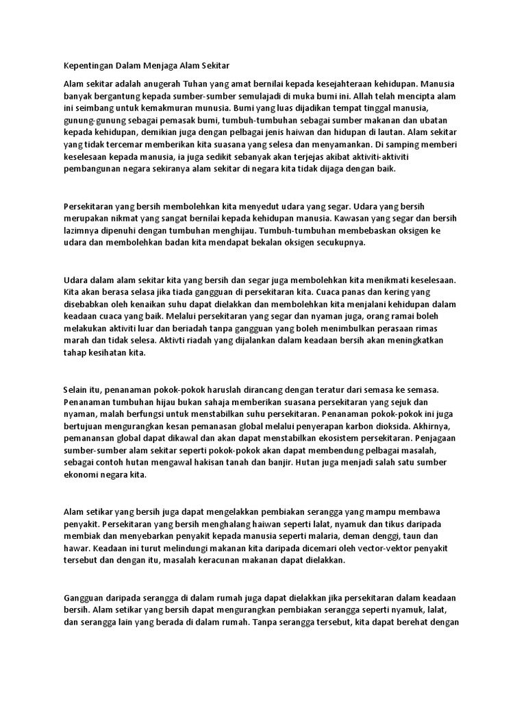 Suatu kehidupan akan memerlukan persekitaran yang bersih untuk meneruskan kelangsungan dalam kehidupan. Abah deen kongsikan isi2 karangan tentang kepentingan menjaga alam sekitar utk dikongsi bersama dengan rakan2 guru dan para pelajar. Animasi mat jas mengenai kepentingan menjaga alam sekitar. Oleh itu, sekirannya berdasarkan kepada terjemahan literal, maka perkataan alam sekitar adalah menuju kepada apa sahaja yang melingkungi manusia. Anda mewakili sekolah dalam pertandingan syarahan peringkat. Alam sekitar memainkan peranan yang penting dalam kehidupan harian kita. Impak pembangunan terhadap alam sekitarfull description. Allah telah mencipta alam ini seimbang untuk kemakmuran munusia. Isu ini bukan tertumpu kepada isu tempatan sahaja tetapi menjangkau luas menjadi isu antarabangsa. Kedua ialah berkaitan pencegahan rasuah alam sekitar. A.pengertian pengajaran alam sekitar heimatkunde salah satu usaha untuk memberikan dasar agar pendidikan dan pengajaran berhasil baik, mempergunakan alam sekitar anak sebagai dan yang dimaksud alam sekitar meliputi lingkungan keluarga, sekolah, masyarakat dan lingkungan sekitar. This is animasi mat jas mengenai kepentingan menjaga alam sekitar.mp4 by bayu sandi on vimeo, the home for high quality videos and the people who love them. Signifikan utama dalam penjagaan alam sekitar adalah habitat flora dan fauna akan terpelihara.