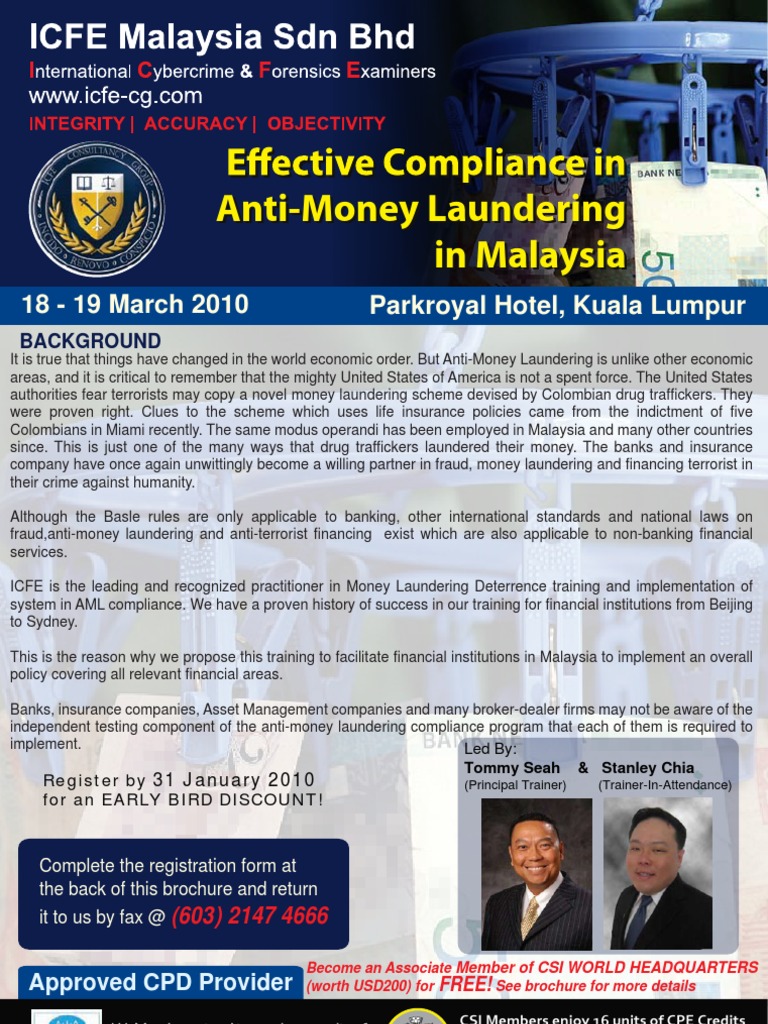 An electrical and home appliances supply company director in malaysia was charged in three separate sessions courts yesterday, bernama reports. Standard chartered bank malaysia berhad makes no warranties, representations or undertakings about and does not endorse, recommend or approve the contents of the 3rd party website. Although the malaysian aml law is thought to be a piece of legislation that provides a hindrance to money laundering, it may be not an adequate tool in preventing this activity entirely. Malaysia is categorised by the us state department as a country/jurisdiction of primary concern in respect of money laundering and financial crimes. Malaysia was named by the us pentagon as one of the countries through which terrorist funds pass to become legitimate. Downloaded by universiti teknologi mara at 21:04 27 may 2015 (pt). In 2004, malaysia made its first money laundering arrest, which ended in a conviction in december the government of malaysia has added five new arrests in 2005, with a total of 188 money laundering charges valued at rm 29.9 million ($7.9 million). The 1malaysia development berhad scandal (1mdb scandal) is an ongoing political scandal occurring in malaysia. Current situation of corruption and money laundering in malaysia— presentation transcript In particular, it focuses on the latest additions to the list of predicate offenses under the amlatfa. Money, laundering, malaysia, regulations, policies. For that reason, we wish to. Bala shanmugam, mahendhiran nair, suganthi r.