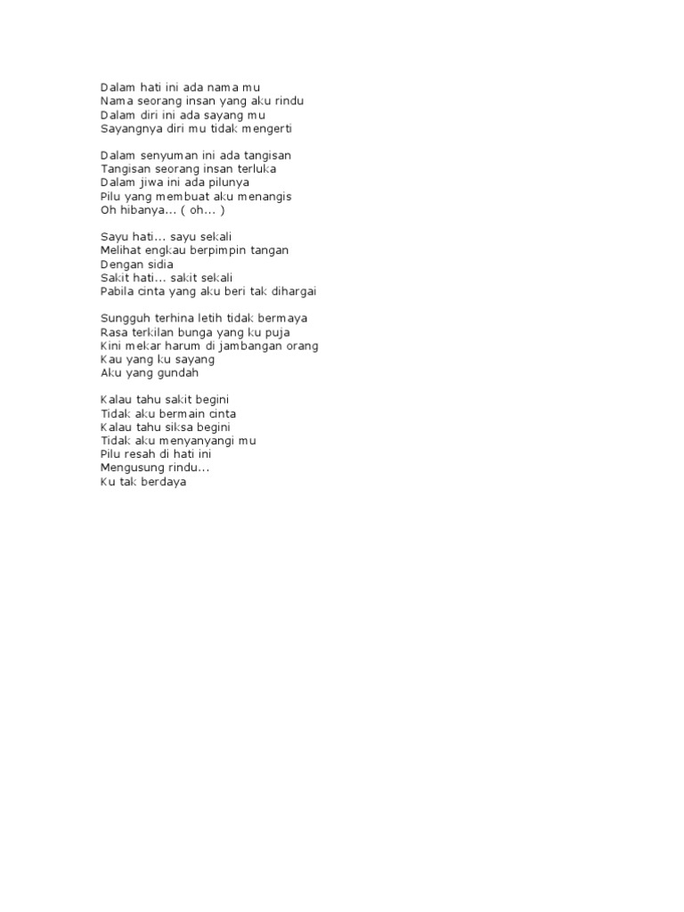Aku sakit hati kau terbangkan ku ke awan lalu jatuhkan ke dasar jurang aku sakit dan ku tak mengerti kau berikan mimpi indah namun kenyataan tak seindah mimpi sadar kini cinta tak berbalas sendiri lagi, sendiri aku, sendiri aku lagi dimanakah. Rasanya tentu saja sakit sekali, ya. Maafkanlah aku, aku selalu berohong…. Sakit ulu hati merupakan suatu keadaan tidak nyaman di daerah antara bagian bawah tulang dada dan pusar. Hatiku rindu kamu rindukan belaianmu rindukan manjamu rindukan kasih sayangmu hatiku rindu sakit hati sakit sekali lagi.