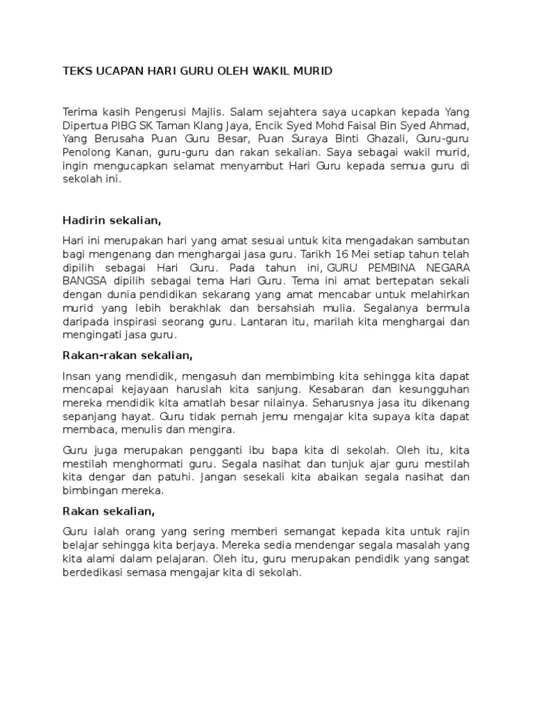 Sekian sahaja ucapan dari saya, saya sudahi dengan wabillahi taufik walhidayah, wassalamualaikum w.b.t. Teks ucapan wakil murid sempena hari guru 1. Ucapan selamat hari guru umum. Tentu saja anda akan menyebutkan ayah, ibu, kakek, nenek, bahkan guru di sekolah. Pada kami, guru kami ini iaitu pn hjh janatu bukan sahaja guru.
