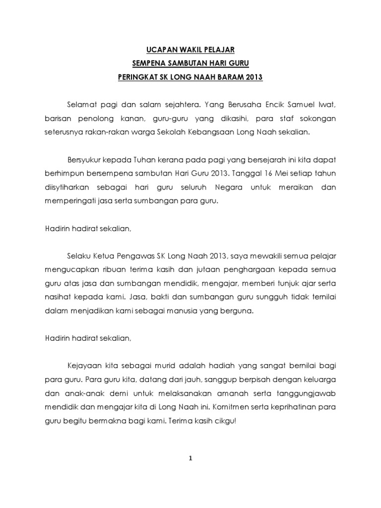 Ucapan wakil pelajar sempena persaraan guru besar. Tak henti kami mendoakan, mengisahkan selamat hari guru nasional tahun 2020 untuk guru yang mulia. Diari simpang kiri ucapan majlis persaraan oleh wakil pelajar murid. Teks ucapan wakil keluarga pengantin. Teks ucapan wakil murid sempena hari guru terima kasih pengerusi majlis. Bahasa inggris selamat hari guru. Teks ucapan wakil pelajar sempena sambutan hari gurubismilahhirahmanirahim. Bagaimana tidak, kamu tentu belum pernah bukan melihat seorang guru yang mengenakan atribut berbagai macam pangkat pada bajunya? Majlis pada pagi ini diteruskan dengan ucapan wakil pelajar, untuk itu dipersilakan nama pelajar selaku ketua pengawas untuk menyampaikan ucapannya. Kadang pening nak karang teks. Guru merupakan salah satu orang yang paling berjasa untuk memajukan kehidupan bangsa, khususnya. Hanya ingin mengatakan betapa kami bersyukur telah menjadi muridmu. Ucapan wakil pelajar majlis perpisahan guru berpindah.