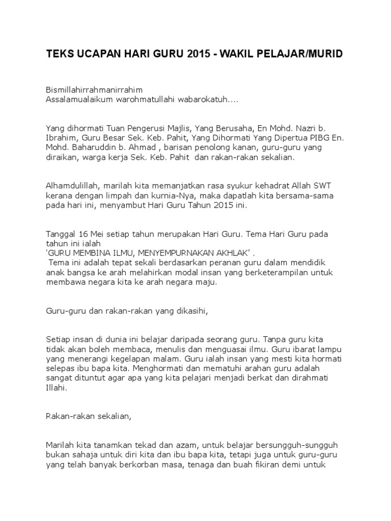 Ucapan daripada wakil pelajar smk bukit besar. Selamat hari guru untuk semua guru hebat dimanapun kalian berada. Teks ucapan wakil murid sempena hari guru terima kasih pengerusi majlis. Sekian sahaja ucapan dari saya, saya sudahi dengan wabillahi taufik walhidayah, wassalamualaikum w.b.t. Teks ucapan hari guru bismillah hirrahman nirrahim , yang berbahagia, ydp pibg smk tun mutahir, en.
