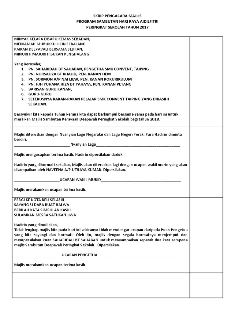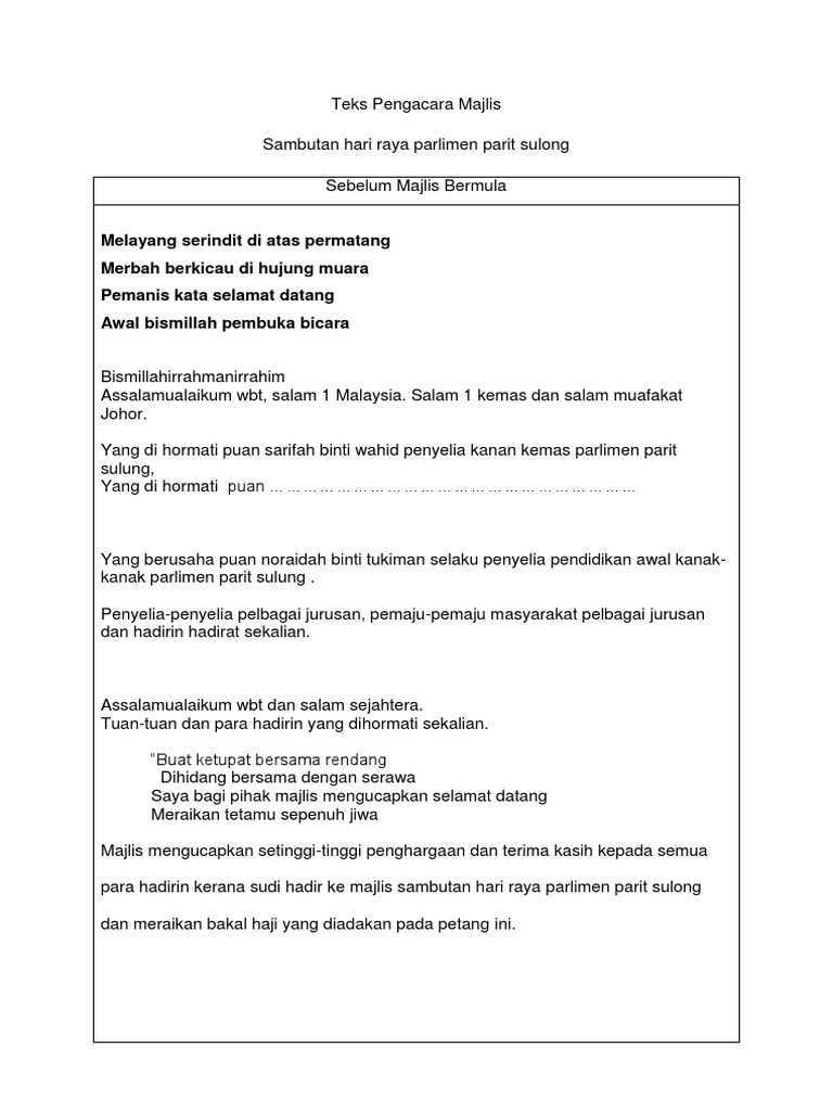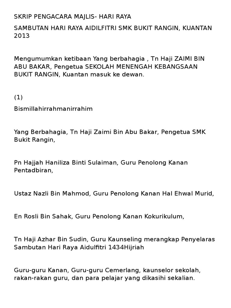 Pada bulan julai yang lalu kita semua sedang menjalani ibadah puasa justeru itu sambutannya terpaksa dilewatkan dan hari para hadirin yang dihormati sekalian, majlis diteruskan lagi dengan jamuan hari raya aidilfitri. Selamat hari raya minal idil wal faizin maaf zahir batin. Teks pengacara majlis persaraan pn hajah faridah abdul rahman. Teks pengerusi majlis sambutan ambang merdeka. Teks pengacara majlis graduasi 2019. Savesave teks pengacara majlis sambutan hari raya aidilfitr. Lemang dihidang enak rasanya nasi arab pilihan kita bingkisan kata bingkisan raya tuan guru besar bermadah kata. Minta kerjasama semua murid untuk memberi laluan. Berikut adalah teks pengacara majlis, mc untuk majlis sambutan maulidur rasul peringkat sekolah menengah dan rendah. Majlis diteruskan dengan ucapan aluan, dan untuk menceriakan sambutan hari raya aidilfitri ini, majlis dengan sukacitanya mempersilakan yang berbahagia en. Kami merafakkan rasa kesyukuran kepada mu kerana telah mengizinkan kami untuk meraikan majlis sambutan hari guru (tahun 2010). Contoh proposal pengajuan atribut dan baju paskibra. Majlis mengucapkan ribuan terima kasih di atas pembacaan doa itu tadi.