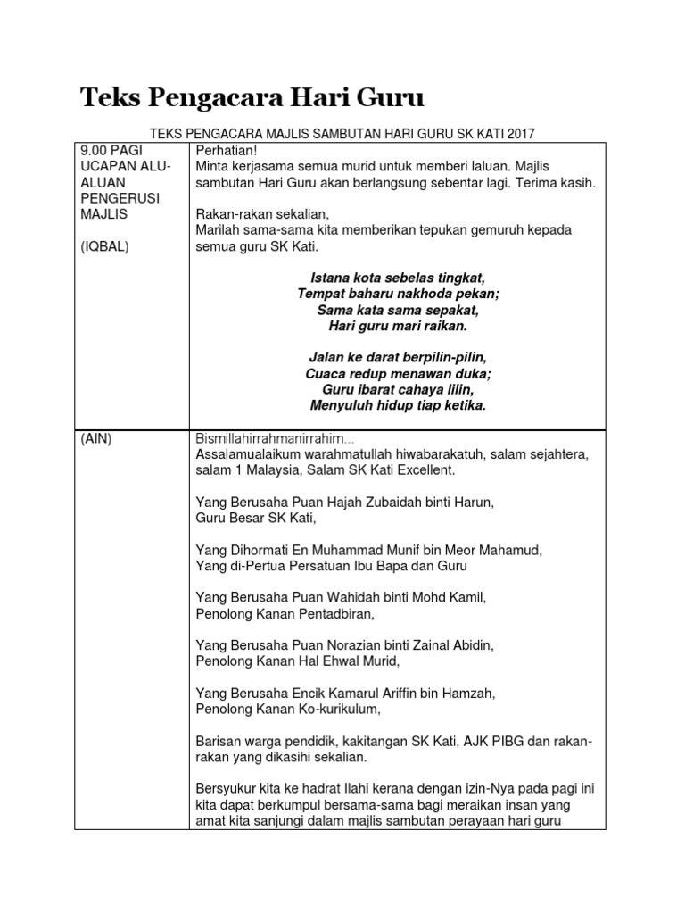 Teks pengacara majlis sambutan hari guru sk kati 2017. 3 cara untuk menyampaikan pidato terima kasih wikihow. Contoh teks terbaik dan lengkap dari mula program sehingga akhir penutup. Teks pengacara majlis persaraan pn hajah faridah abdul rahman. Koleksi teks pengacaraan majlis rasmi sekolah.